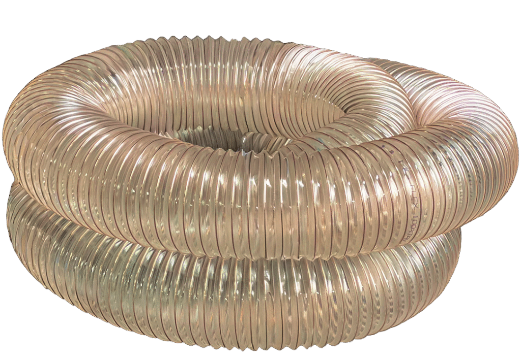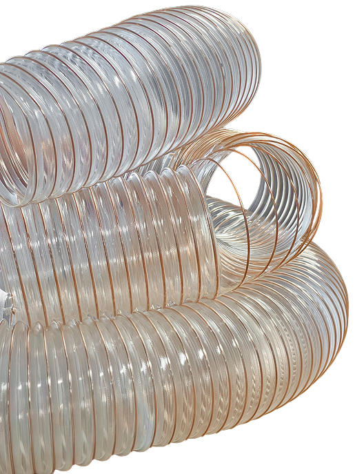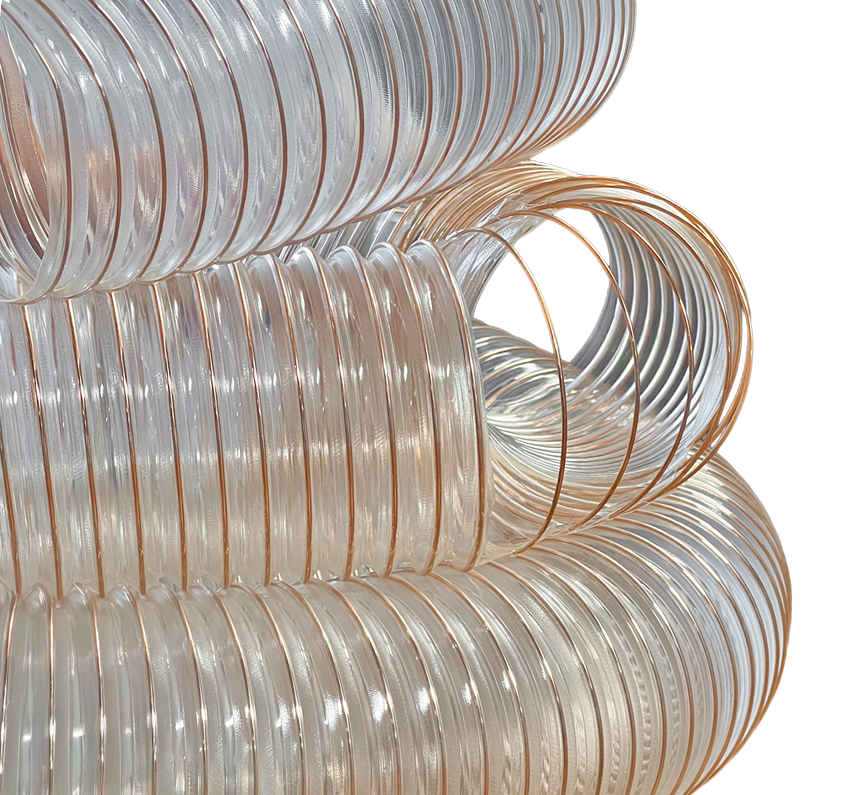 A MGFLEX fabrica os diâmetros de 40mm a 600mm do modelo de mangueira PUR-AC construída com poliuretano virgem e espiral de aço mola na cor cobreado.